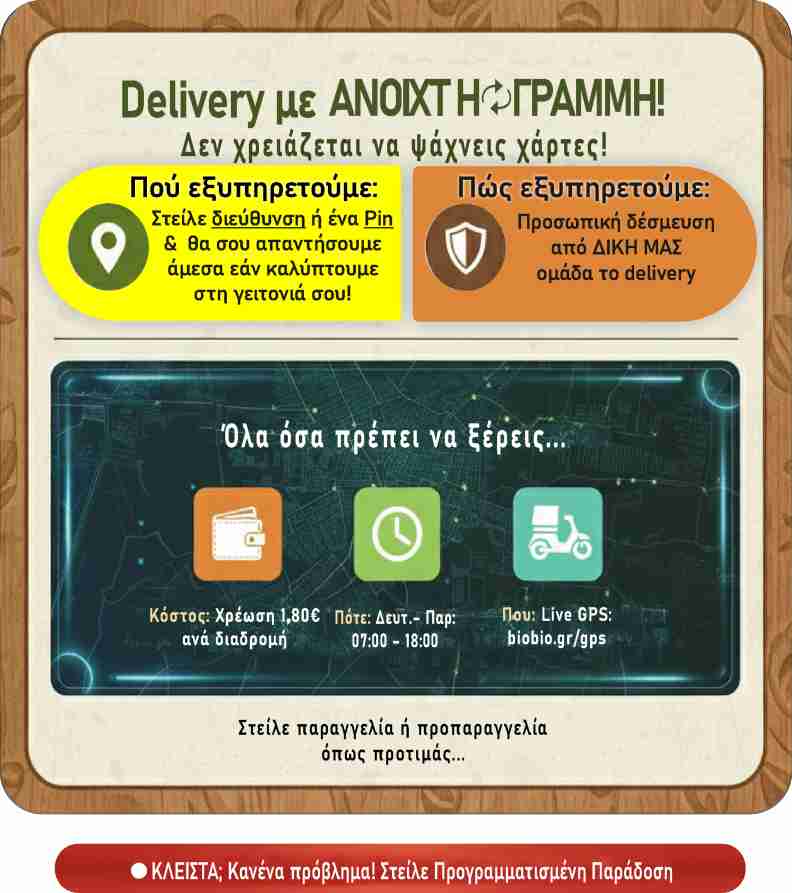 👋 Πρώτη φορά εδώ; ✕🛵 Διανομή-Delivery▼🍴 Οδηγίες παραγγελίας▼💳 Τρόποι πληρωμής ▼📋 Είναι μόνο Βιολογικά;▼📋 Πρόβλημα παραγγελίας;▼🛡️ Τι είναι η Ανοιχτή Γραμμή;▼ -